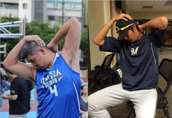 手王維中,在粉絲團上傳模仿連勝文動作的照片,還開玩笑說「丟球前的伸展運動是很重