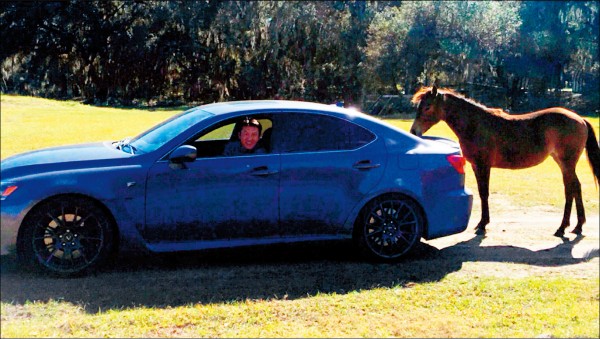 棒球學校「校馬」莉比捨不得建仔走,還用嘴巴頂住建仔的後車廂。(取自網站)