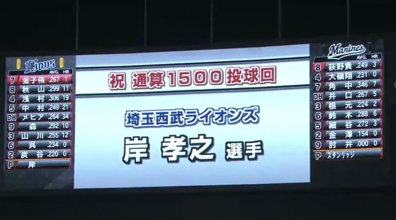 岸孝之完成1500局投球後,羅德主場記分板也送上祝福