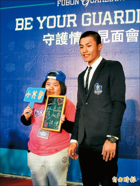 富邦悍將李宗賢(右)和熱情球迷互動。(記者林宥辰攝)