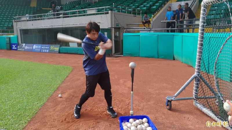 中信兄弟彭政閔打擊練習。(記者吳清正攝)