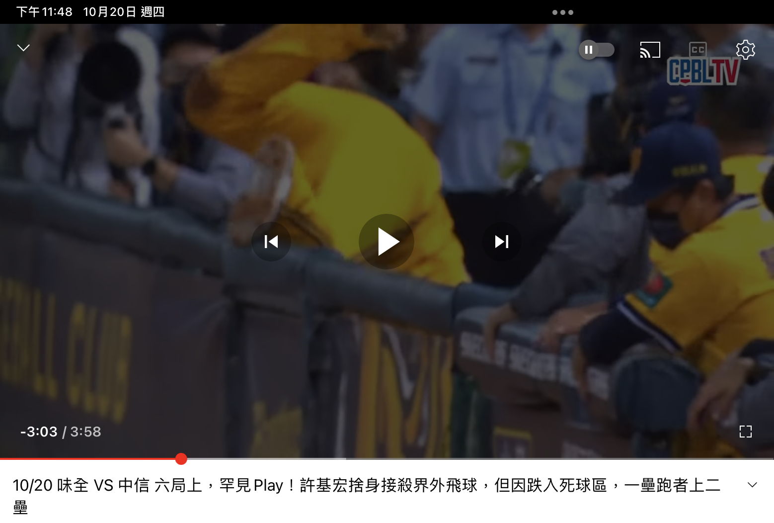 6局上一壘有人,林威廷擊出一壘界外飛球,許基宏快腿飛奔,翻過攝影區接到球,當場倒