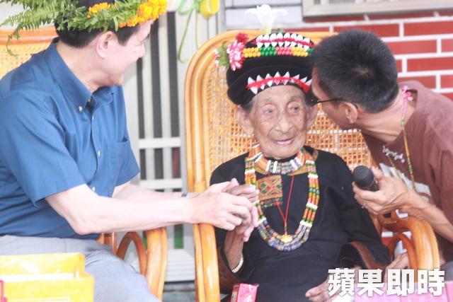 總統馬英九今天到屏東縣三地門鄉青葉村,探視112歲的魯凱族人瑞彭玉梅女士。彭玉梅送