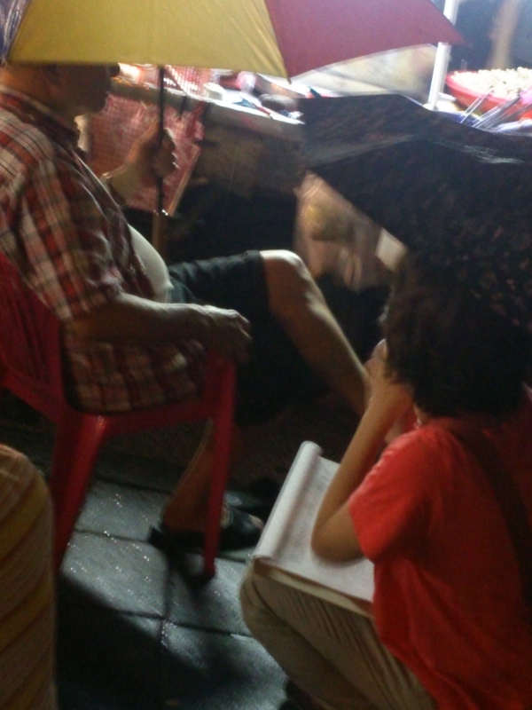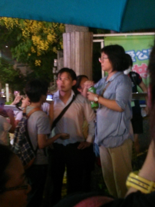 雨勢漸大繼續冒雨演說(左邊的阿伯自動上台幫忙撐傘)