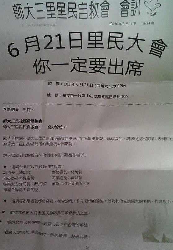 請看師大三里里民自救會四處塞信箱的文宣,正面寫說是「里民大會」