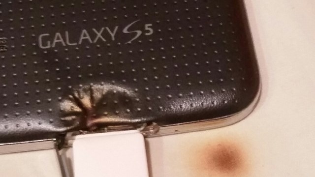 Galaxy S5 買入不到兩個月,他強調自己是用原廠充電器,不過最終還是發生了意外,