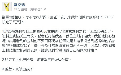 : 不一致,因為我沒想到會上報然後牽扯到我老頭,誰會想對父母講說自己被摸奶的事?