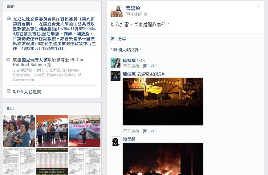 碧玲深夜12點37分在臉書留言:「以為打雷,原來是爆炸事件!」民進黨籍高雄市議員康