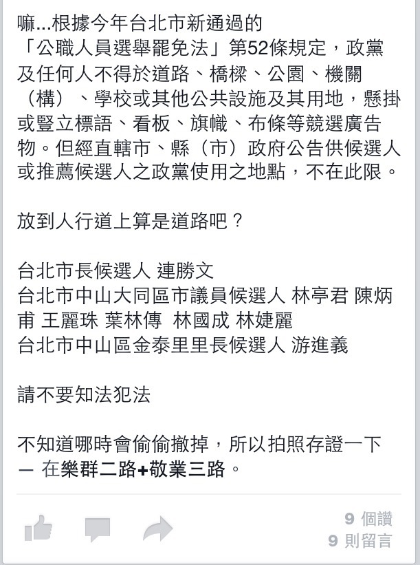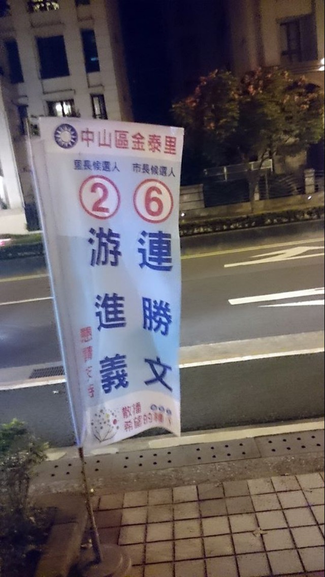 2014-11-14 21:52:00KMT的里長旗子都會印上連勝文 我們這邊的也是...反正被檢舉就說是里長插的 輕鬆切割