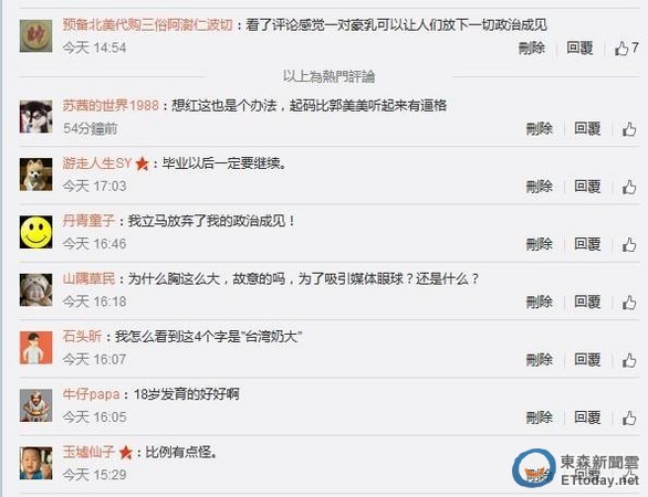▼大陸網友看到新聞後把焦點放錯,直言「豪乳可以讓人們放下一切政治成見。」