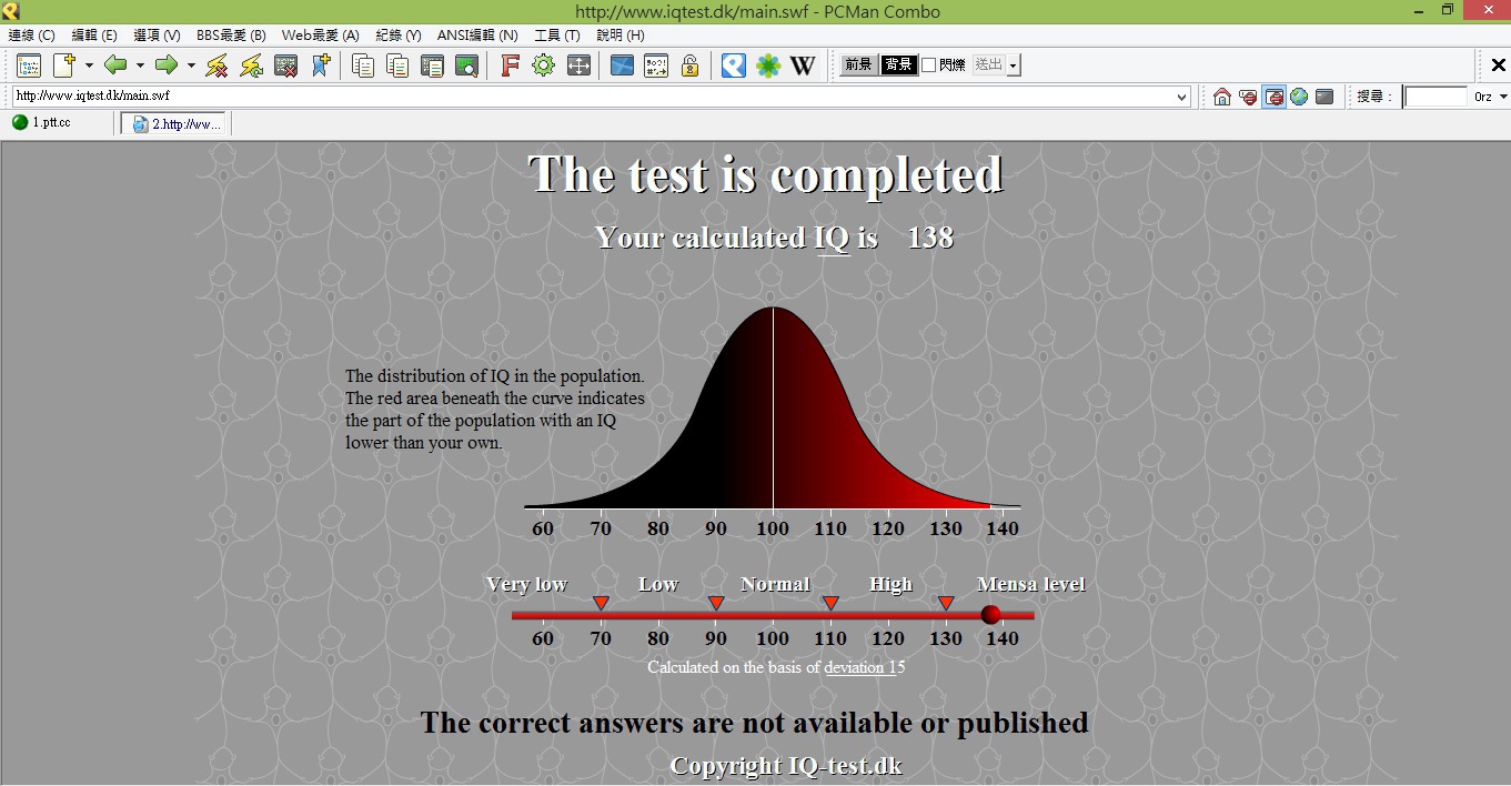 130整,這還蠻舊的題目...有兩題亂答- -順便說一下八卦,不只答對題數,時間也會影響喔。越短越好。所以玩第二次測出來的智商應該會變高XD