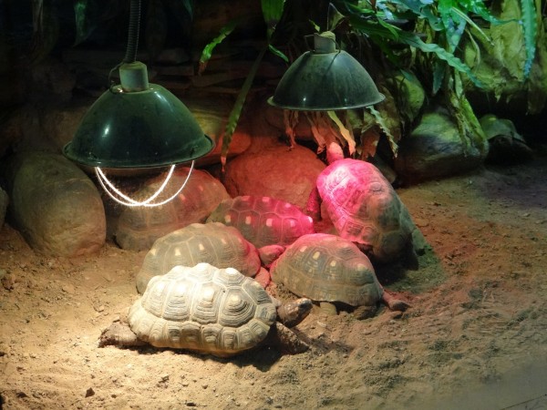 陸龜怕冷,爭相搶保溫燈取暖。(台北市立動物園提供)