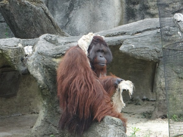 紅毛猩猩則最善用麻布袋,會隨身攜帶或披在身上禦寒。(台北市立動物園提供)