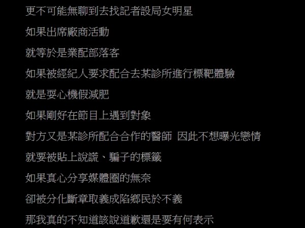 而是要翻舊帳討拍,她寫完向鄉民喊「我真的不知道該說道歉還是要有何表示」。