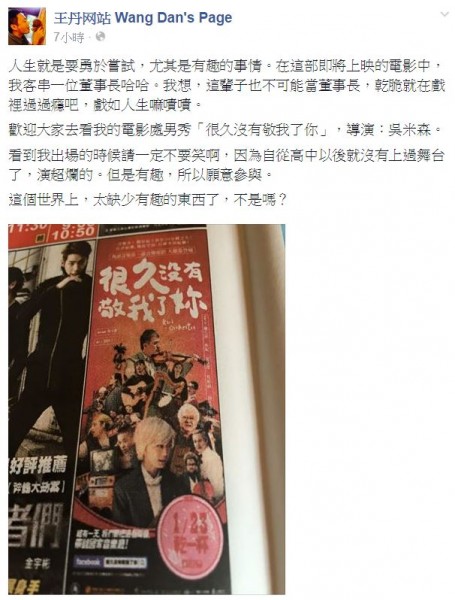 王丹今日(10)在臉書發文宣布,自己挑戰了導演吳米森的電影《很久沒敬我了你》,並