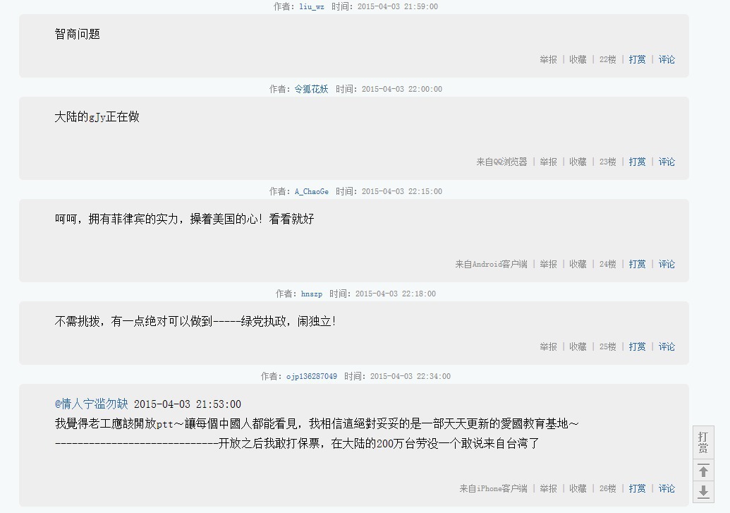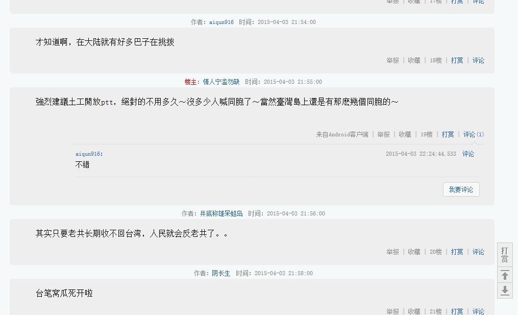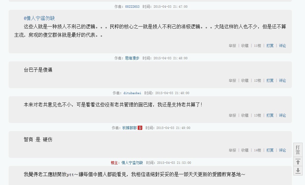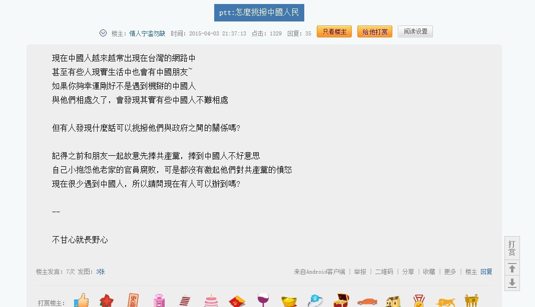 以我在兩邊穿梭的心得,PTT發文限制較高,但言論尺度很寬;天涯論壇就完全相反,隨便