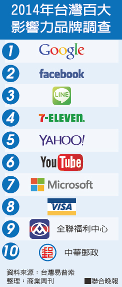 全聯福利中心,在台灣原創影響力品牌排行榜躍居第一,擊敗2013年的中華電信;另2014