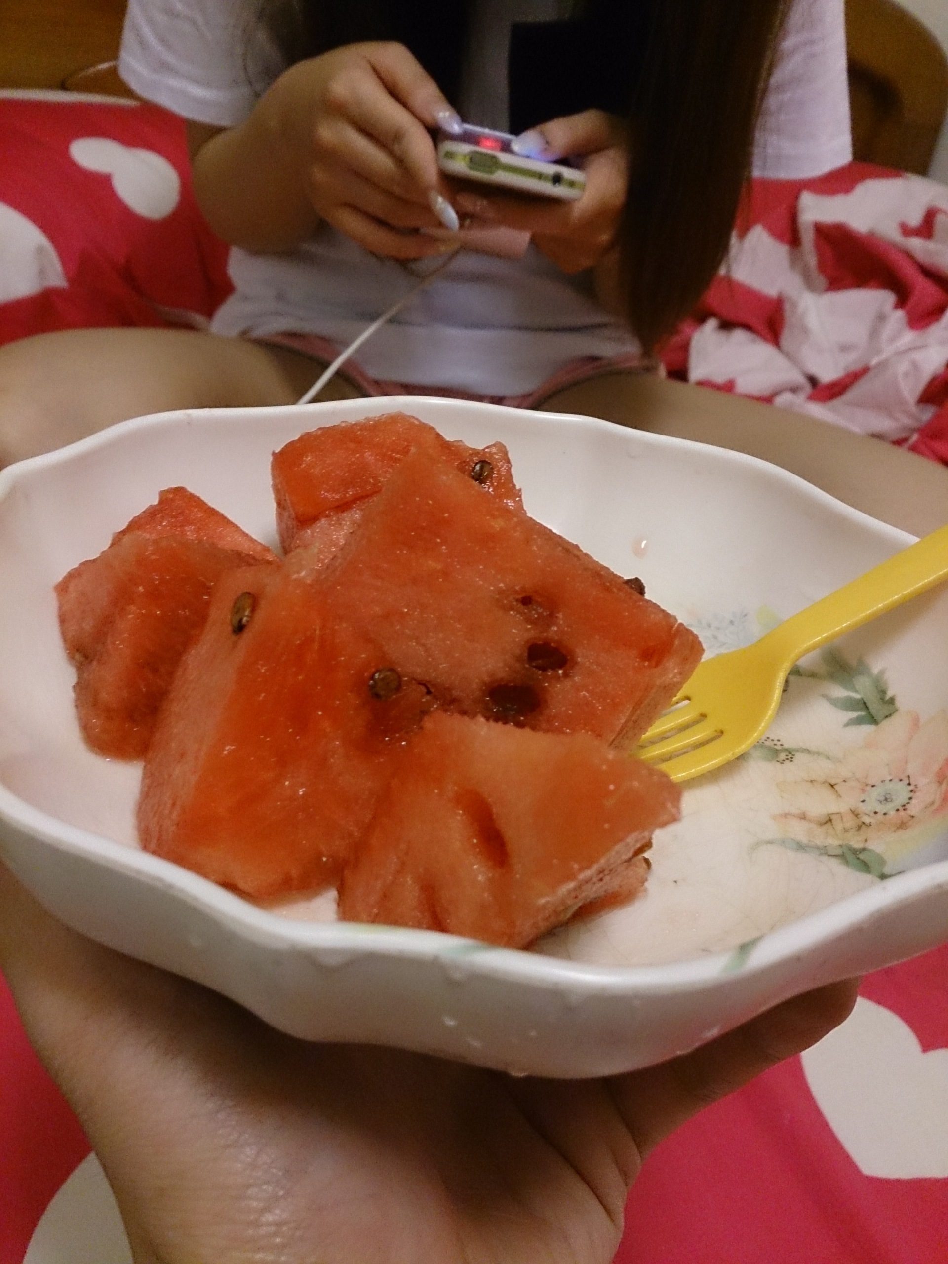 因為她為了練習切了好多西瓜,說吃不完要叫我幫忙