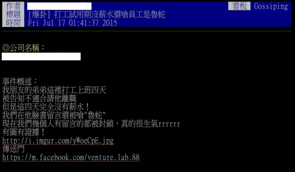 網友在PTT八卦板發文控訴老闆以試用期為由沒發薪水。(圖擷取自PTT)