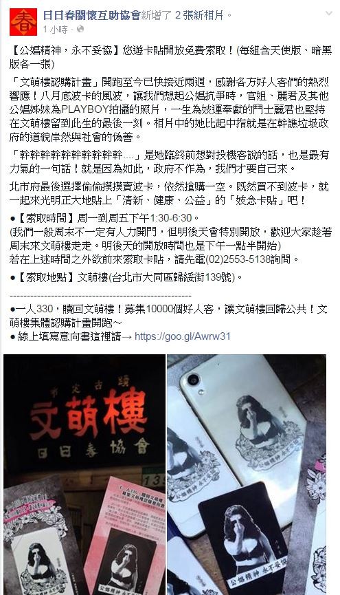 日日春在臉書公布,「妓念卡貼」將在台北市歸綏街的文萌樓開放免費