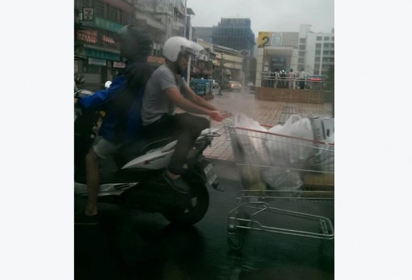 網友在《爆料公社》上傳一張照片,照片一名男子騎著機車,後坐的男子則反坐,拉著一