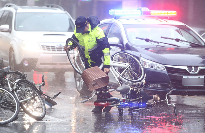 (非本文當事人)日前強颱杜鵑來襲,北市一名警察將被吹倒在地的腳踏車移至路邊。