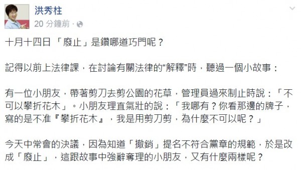 ,改為「廢止」,國民黨總統參選人洪秀柱今深夜透過臉書表示,這與強詞奪理的小朋友