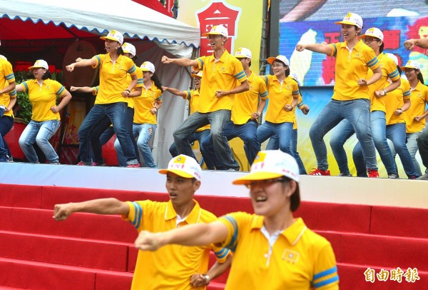 黨歌中的黨操曾被網友諷有「北韓風」,台上表演時,台下民眾也跟著一起跳。(記者王藝
