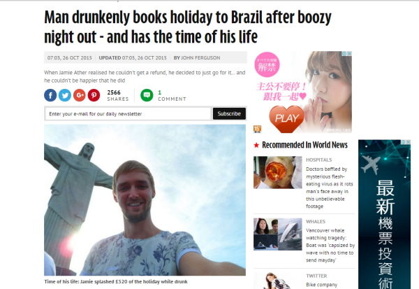 ▲英國一名男子因為酒醉買錯機票,他心念一轉當起背包客去旅行。(圖/翻攝自鏡報)