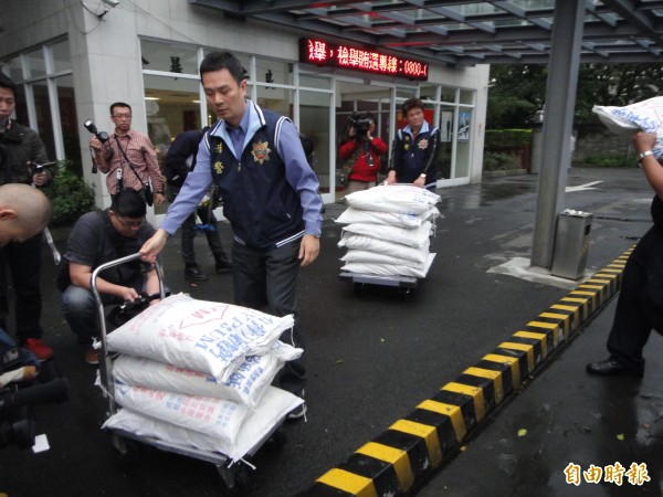 警方查出永昌公司將食用級二水石膏包裝袋(左),套裝在工業級無水石膏(右)