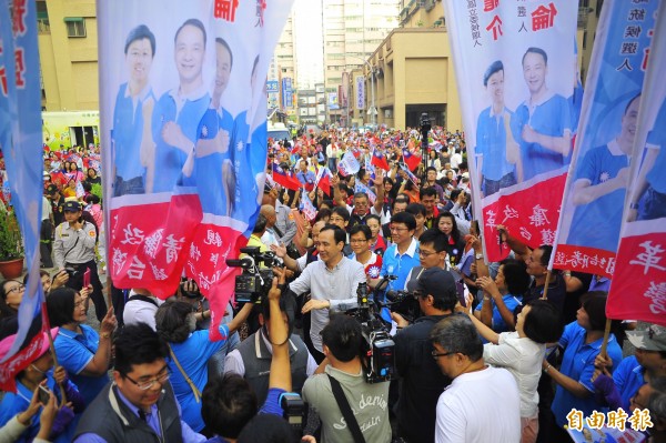 總統參選人朱立倫到台南替立委參選人謝龍介站台,受到支持者包圍。(記者王捷攝)