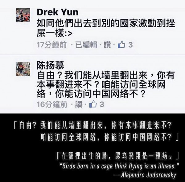 可我們台灣網民卻把自己禁錮在圍墻內,坐井觀天。』