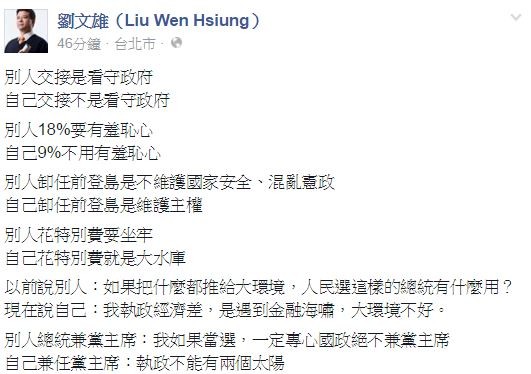 劉文雄臉書全文。(圖擷取自劉文雄臉書粉絲專頁)