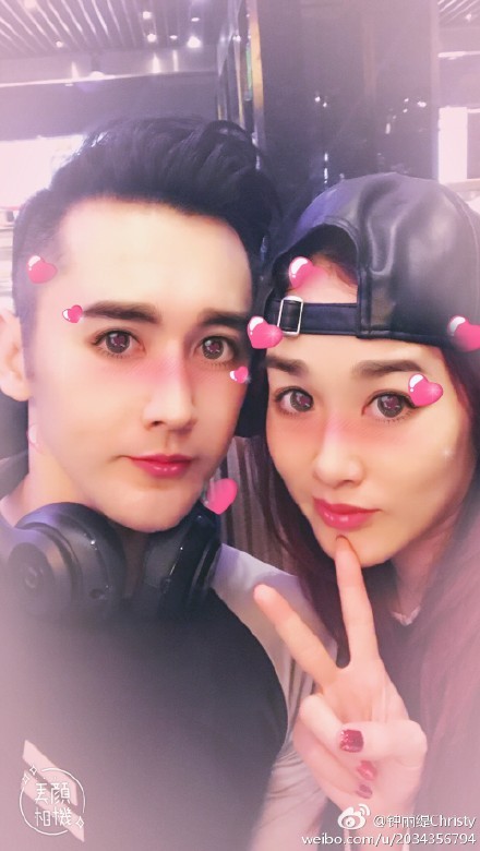 鍾麗緹(右)和張倫碩玩手機P圖軟體。(翻攝自鍾麗緹微博)