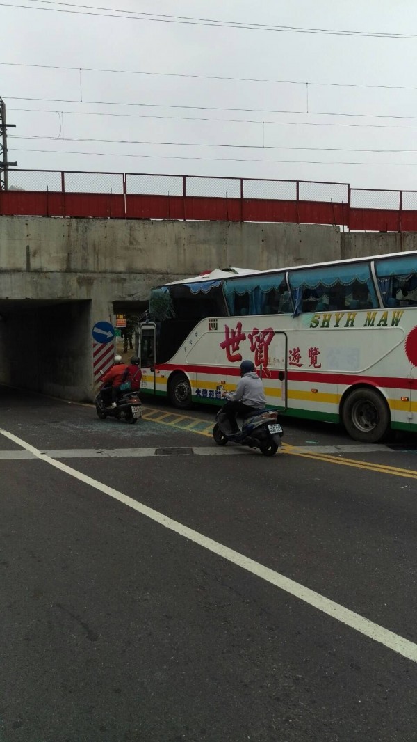 遊覽車卡在地下道口,9人受傷送醫搶救中。(記者黃良傑翻攝)