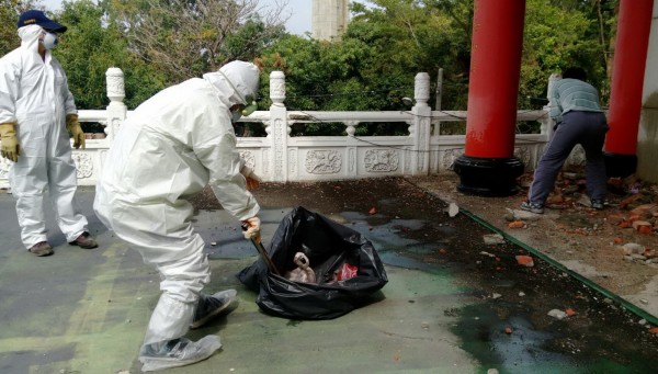 工作人員清理鴿群暴斃,有的人穿防護衣,有的人則沒穿。(議員林美燕提供)