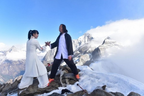 ,在零下16度的低溫身穿紗衣表演太極,更在白雪皚皚的山頂擺出金雞獨立姿勢,架式十