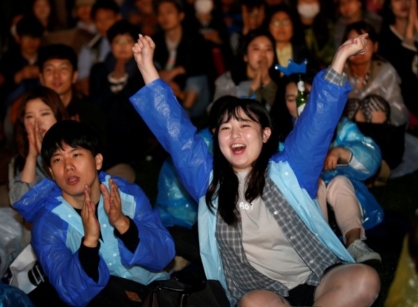 在出口民調公布後,文在寅的支持者高興歡呼。(路透)