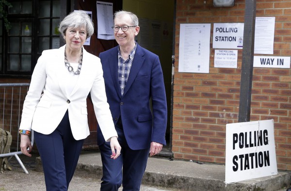英國首相梅伊(左)和她的丈夫菲利浦( Philip)在8日前往投票所投票。(美聯社)