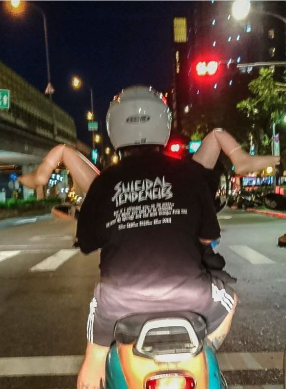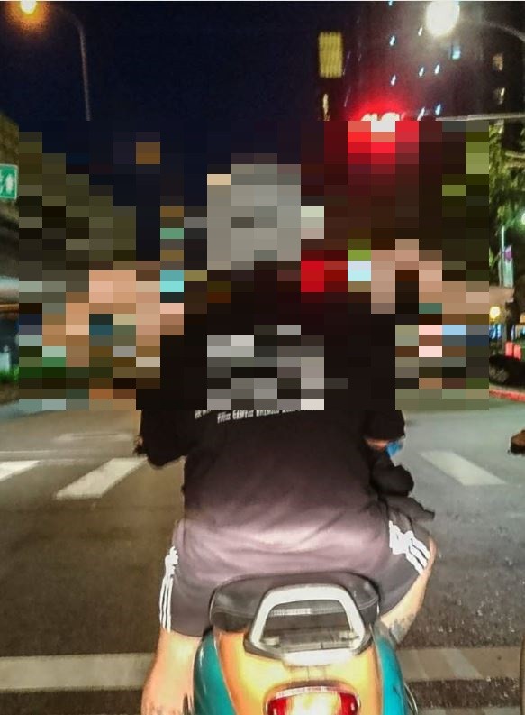 ,令他不禁驚呼說,「騎車載女友兜風是很美好的,但這姿勢猛然一看真的嚇到剛吃完晚
