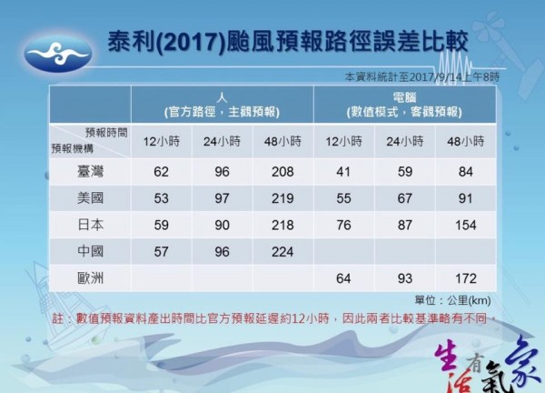 根據辛在勤所貼出的誤差比較表,各國針對泰利做出的人為主觀預報路徑誤差部分,台灣