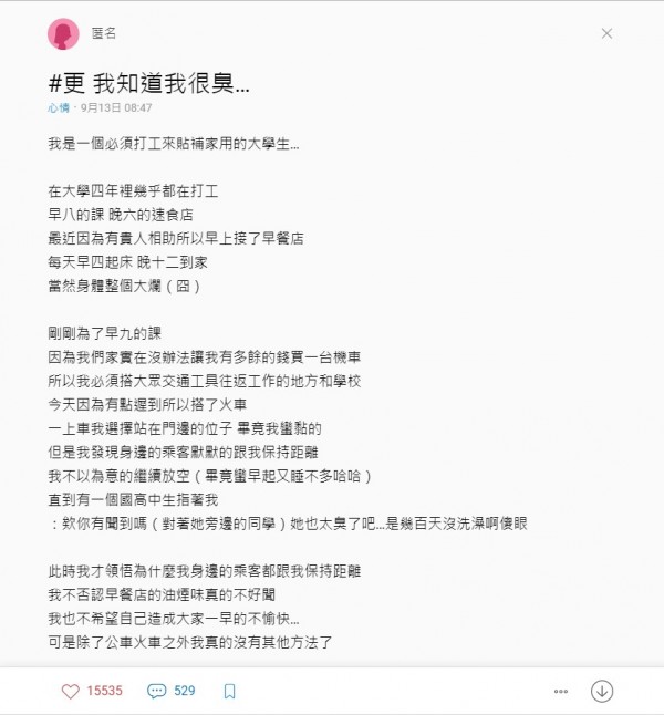 女大生對自己從早餐店辛苦下班後,搭公車還被嫌身上氣味難聞,心裡很不好受。