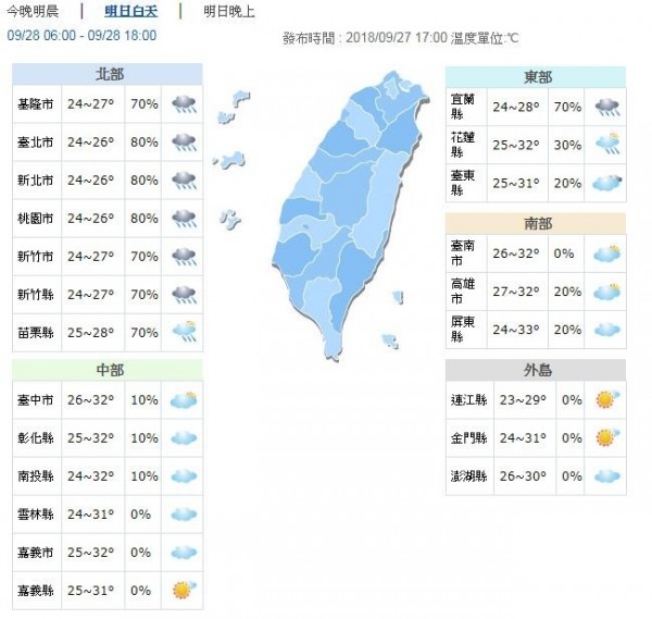 溫度方面,明天白天北部高溫26至28度,東部及外島地區高溫28至31度,中南部高溫31至