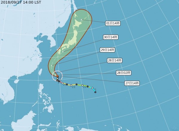 明天午後至後天上午將是第24號颱風「潭美」最靠近台灣的時候。(圖擷取自中央氣象局