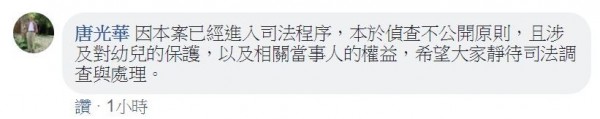 : : 日依強制猥褻罪嫌將唐男送辦,唐鳳的爸爸對此表示,「靜待司法調查」。