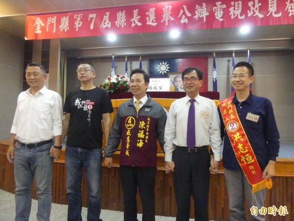 金門縣長選舉戰火交熾,除了另名候選人汪承樺稍晚抵達政見發表會現場,五名縣長候選