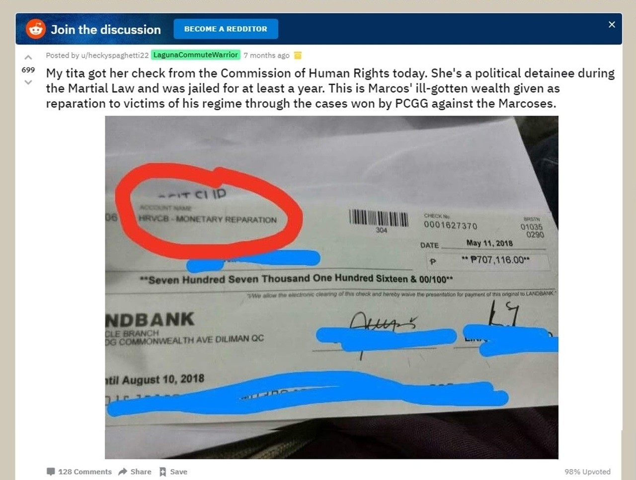 有受難者家屬上傳其家人所收到的補償金證明至網路論壇Reddit上,表示若非廉政委員會追討來的這些錢,他們也不會有機會獲得這樣的補償。 圖/Reddit