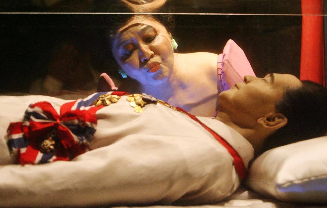圖為9月11日馬可仕冥誕日,伊美黛每一年例行的在玻璃棺前親吻致意。 圖/美聯社