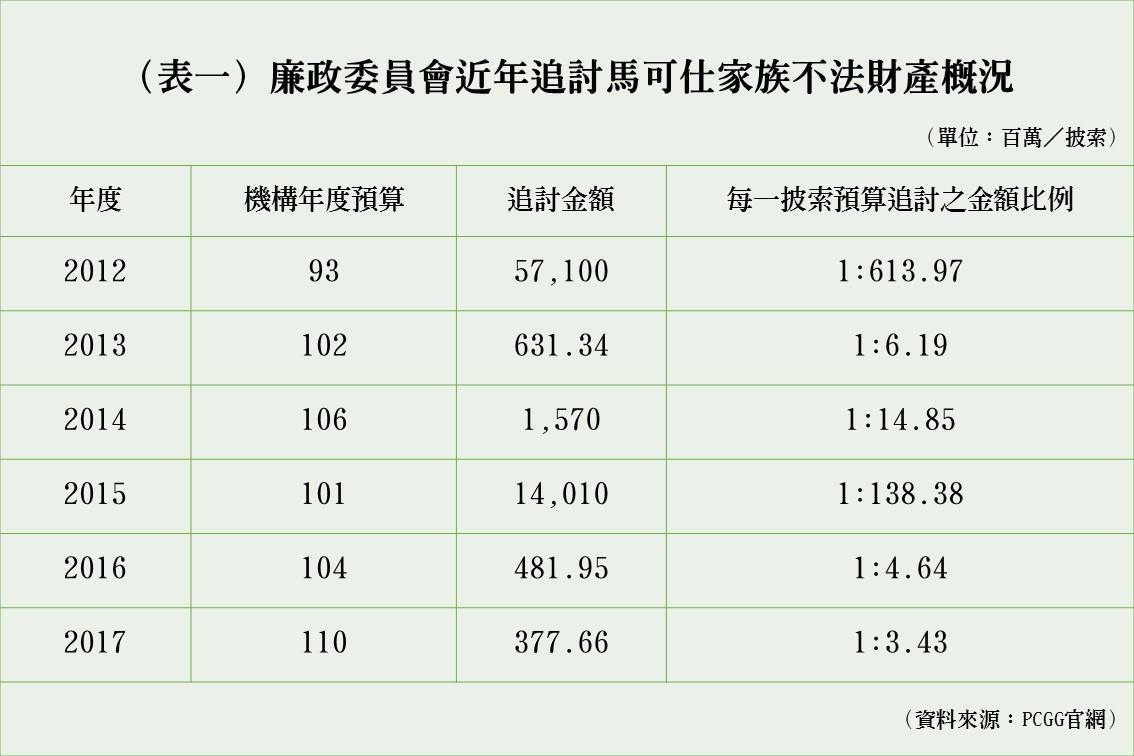 廉政委員會近年追討馬可仕家族不法財產概況。 圖/作者製表;編輯台後製