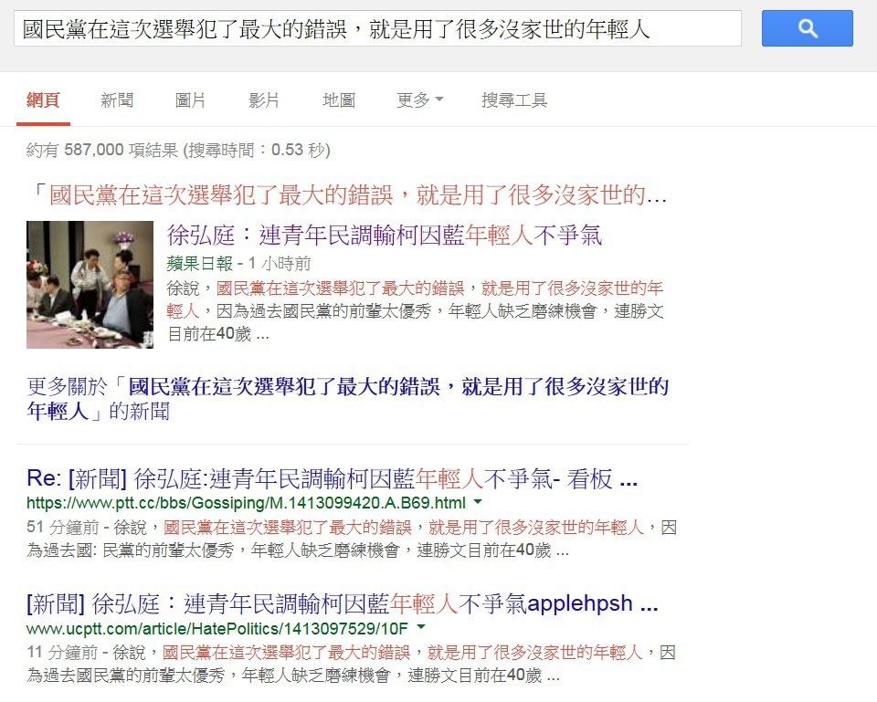 。徐說,國民黨在這次選舉犯了最大的錯誤,就是用了很多沒家世的年輕人,因為過去國